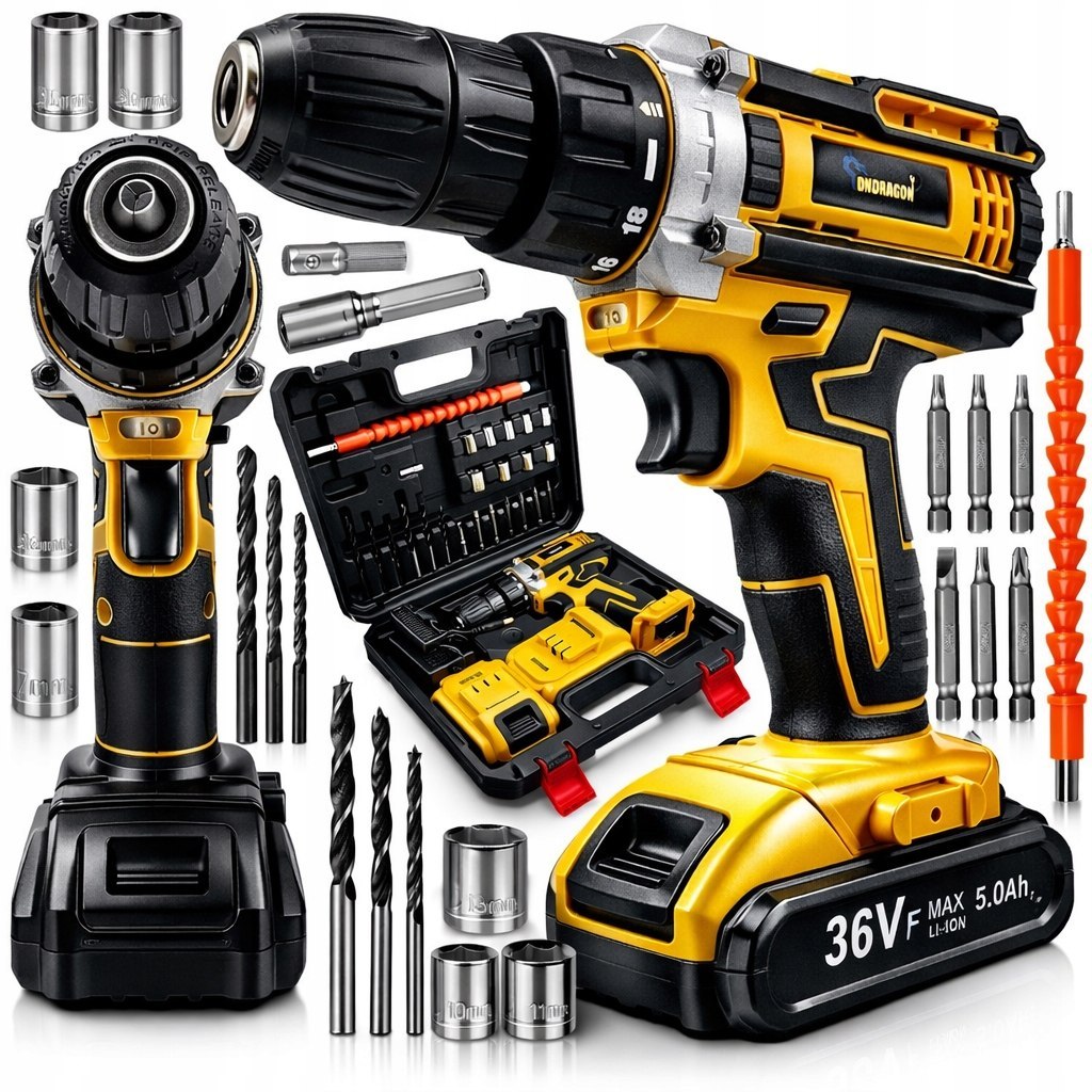 36V AKUMULAČNÍ VRTAČKA-ŠROUBOVÁK S BITY A LED Kapacita baterie 5 A Prvky krytu navíc usnadňují používání. ✅ VLASTNOSTI: