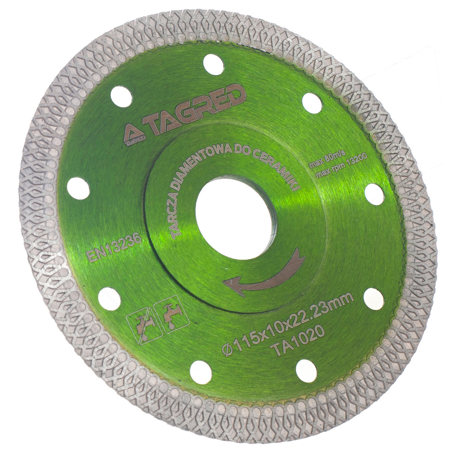 Profesionální diamantový kotouč univerzální TAGRED pro řezání žuly, mramoru, keramiky a terakoty pomocí ručních brusek pracujících za sucha s uchycením 22,23 mm se vyznačuje vysokou kulturou práce, zajišťuje rychlé a precizní řezání všech druhů žuly.