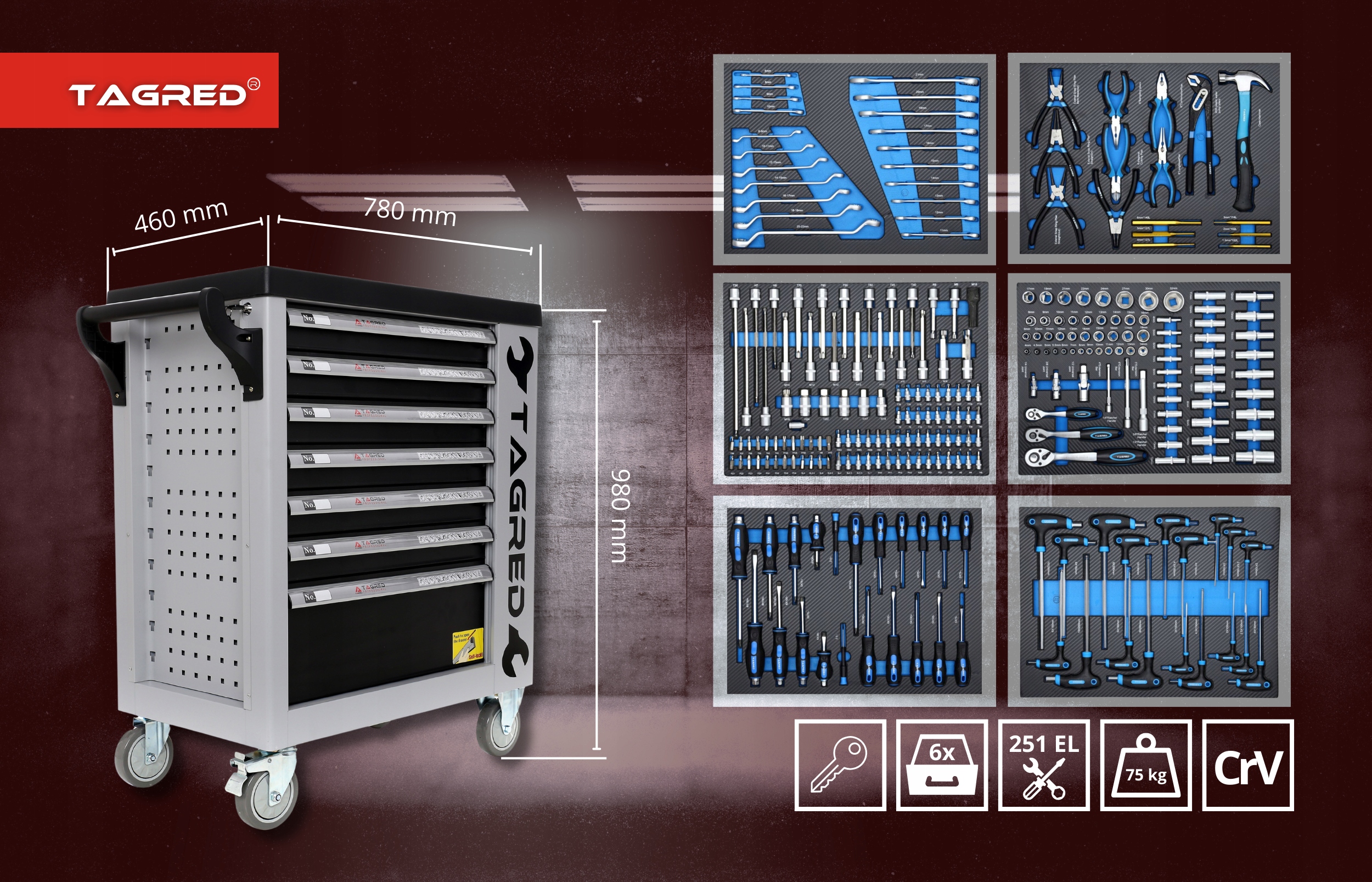 Dílenská skříňka, dílenský vozík s nářadím Tagred TA212 251EL TA212