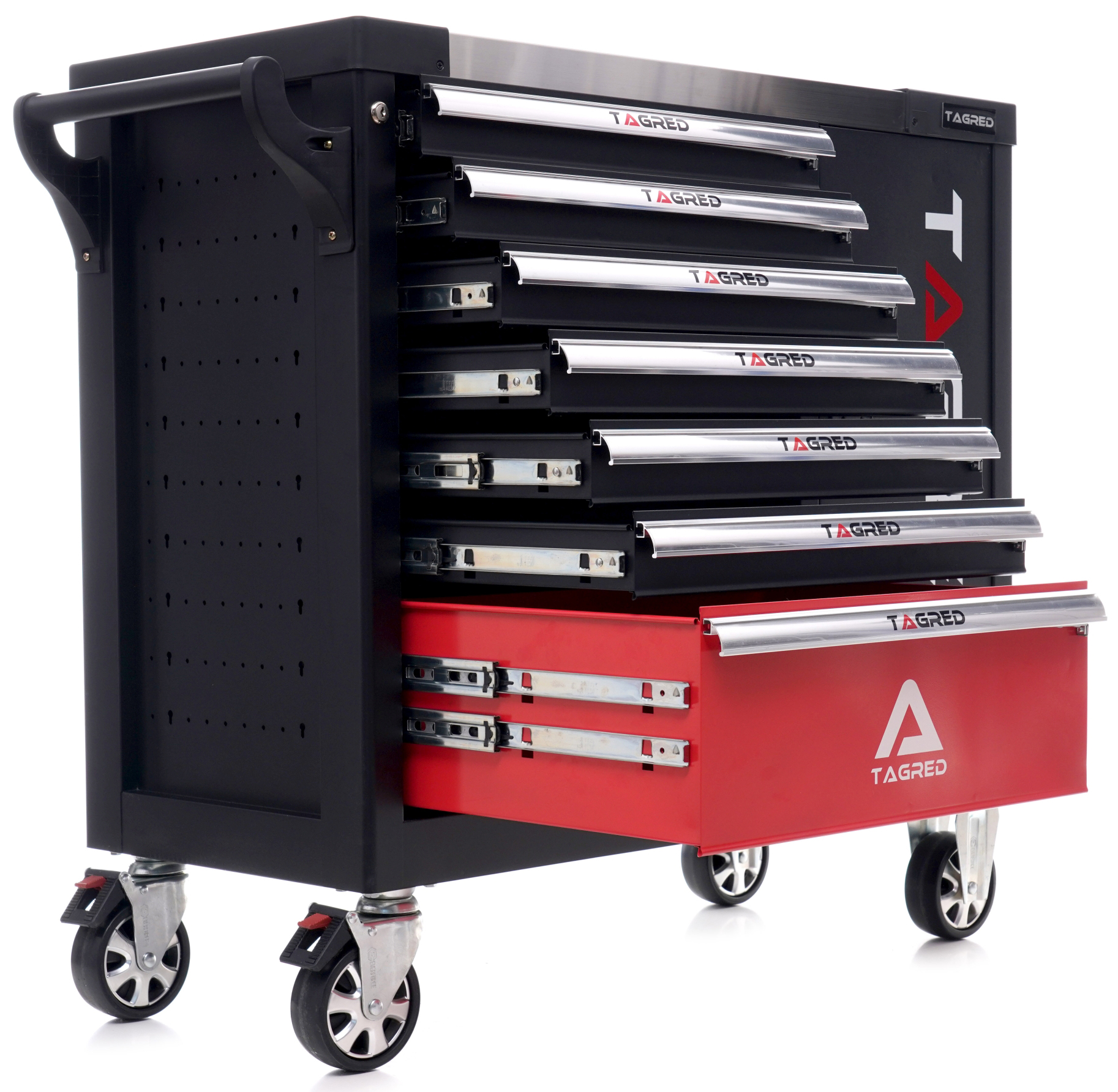 Profesionální dílenská skříň navržená s ohledem na potřeby dílen, autoservisů a výrobních podniků. Umožňuje udržovat pořádek na pracovišti a bezpečné uložení nářadí (vozík je uzamykatelný na klíč). Skříňka má ergonomickou rukojeť integrovanou do boční stěny pro snadnou přepravu a plně výsuvné zásuvky na ložiskách. Centrální zámek se dvěma klíči zamykající všechny zásuvky a dva klíče k úložnému prostoru. Vozík je vybaven 4 kolečky, z toho 2 otočnými, pro snadné manévrování. Rohové nárazníky (chrání před náhodným poškozením např. karoserie automobilu). Dílenskou skříň TAGRED odlišuje deska z leteckého hliníku! univerzálně perforovaná. Součástí sady je dvoupodlažní úložný prostor uzamykatelný na klíč. Sada obsahuje klíče očkoploché, ploché, polygonální a lomené nástrčné. Ráčna je vyrobena z chrom-vanadiové oceli CrV6140. Ráčna je vybavena systémem QUICK RELEASE a mechanismem se 72 zuby. Skříňka je nová, nikdy nepoužitá.