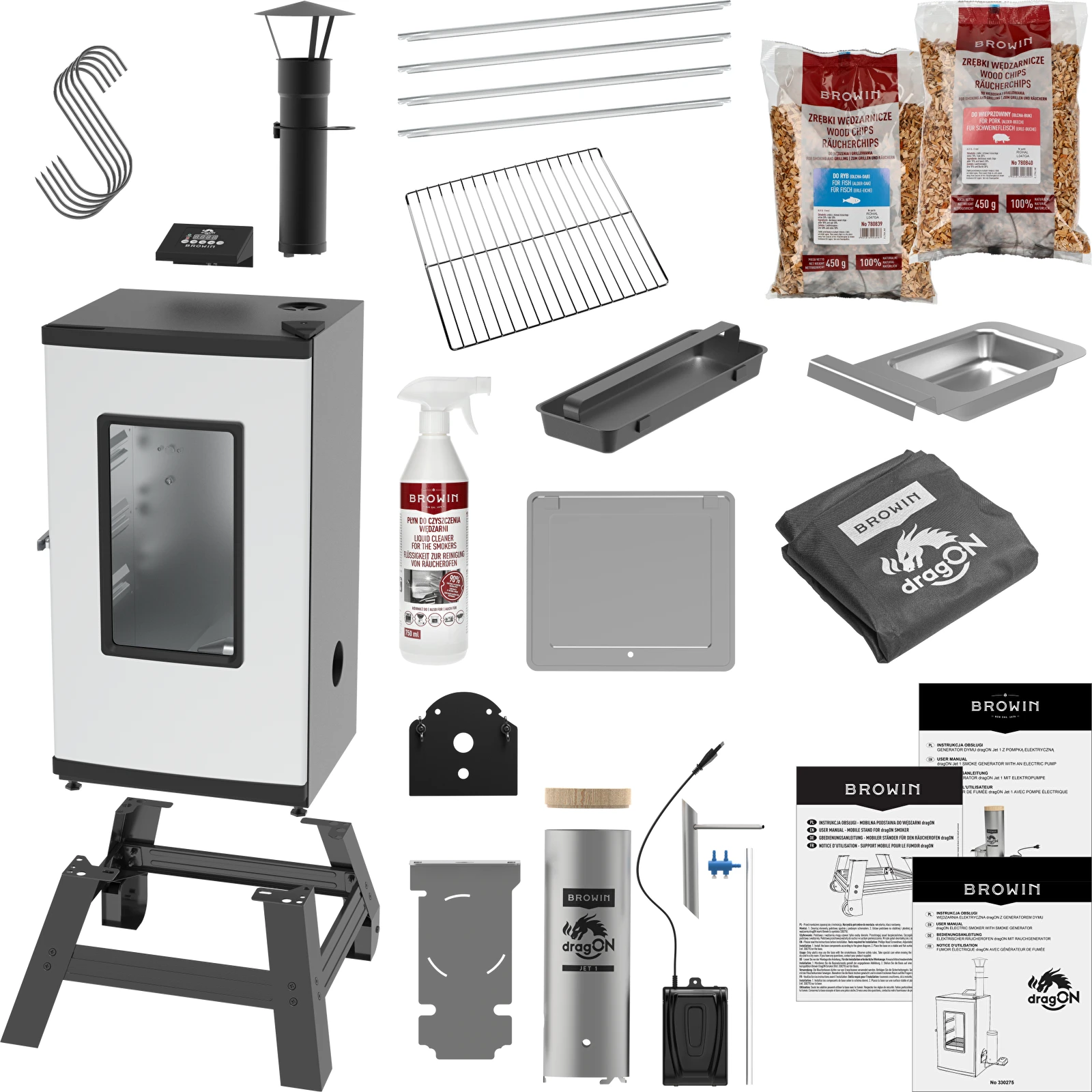 moderní elektrickou digitální udírnu dragON s objemem 65 litrů, s generátorem kouře dragON Jet 1 a příslušenstvím (kód produktu 330275),