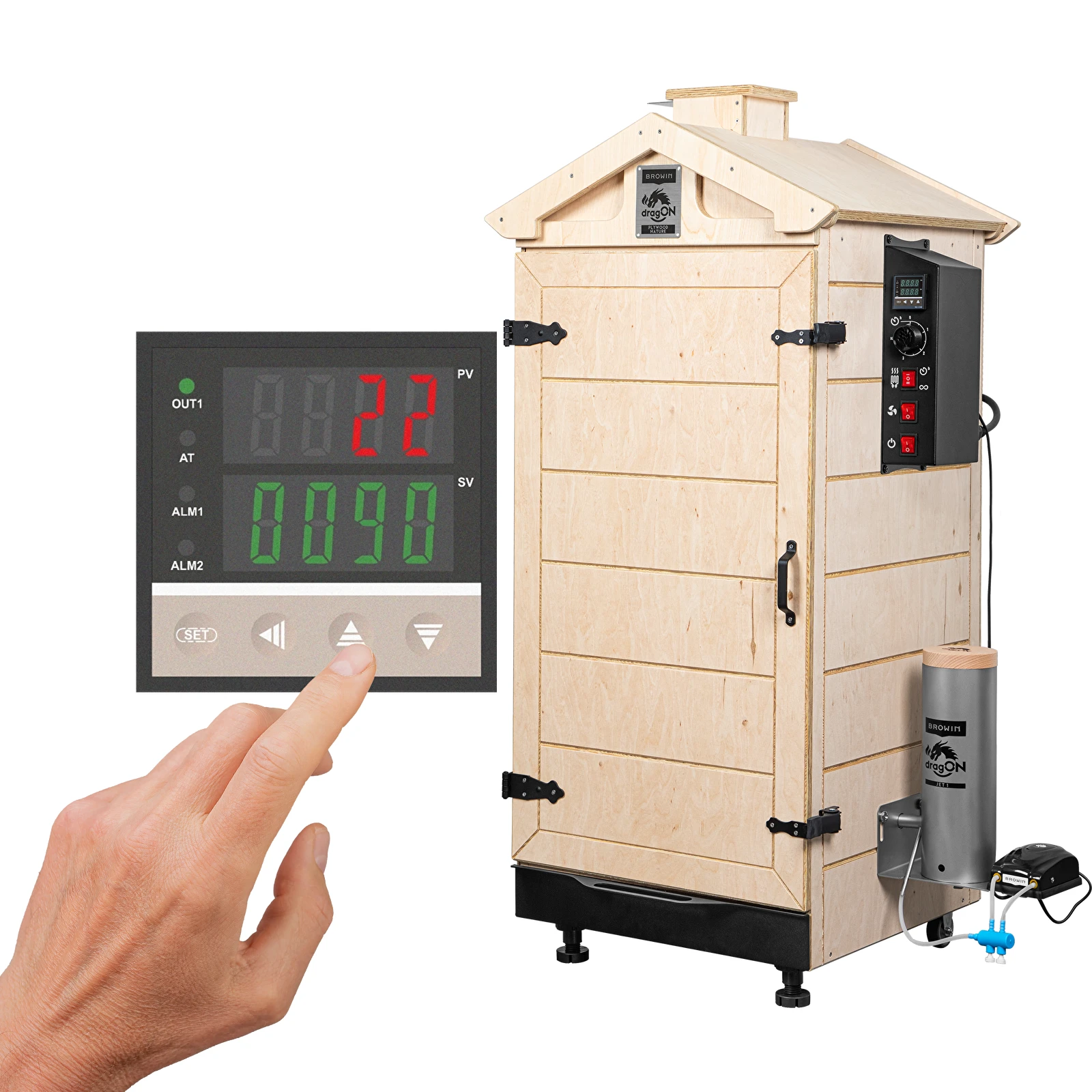 Bezrámová udírna dragon PLYWOOD NATURE je inovativní udírna vyrobená z vysoce kvalitní překližky z tvrdého dřeva (s certifikací FSC), certifikovaná pro potravinářskou výrobu, vybavená patentovaným, účinným generátorem kouře dragon Jet, topnými moduly a digitálním ovladačem.
