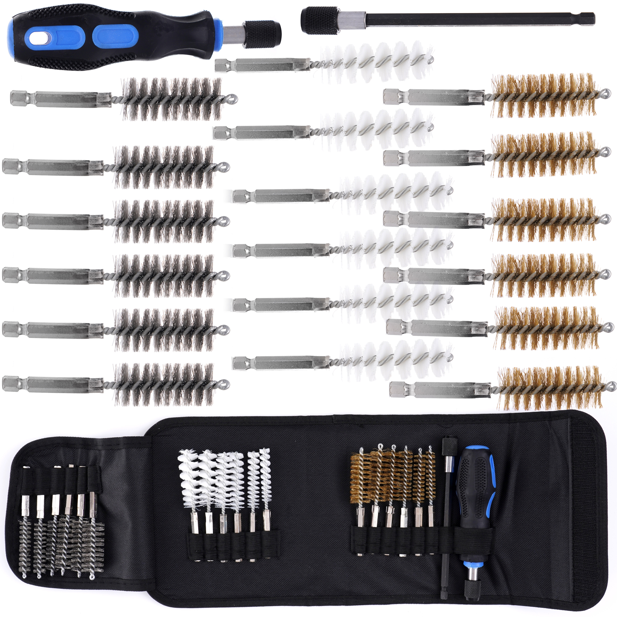 Kartáče na sedla vstřikovačů, sedla zapalovacích a žhavicích svíček. V sadě naleznete prodloužení, rukojeť a kartáče na čištění různé tvrdosti. Kartáče jsou vhodné i pro použití v elektrických a pneumatických vrtačkách. Sada je nesmírně užitečná pro čištění a odjehlování válců, pouzder, trubek, sedel svíček, vstřikovačů atd. Celá sada se vejde do trvanlivého a praktického pouzdra.