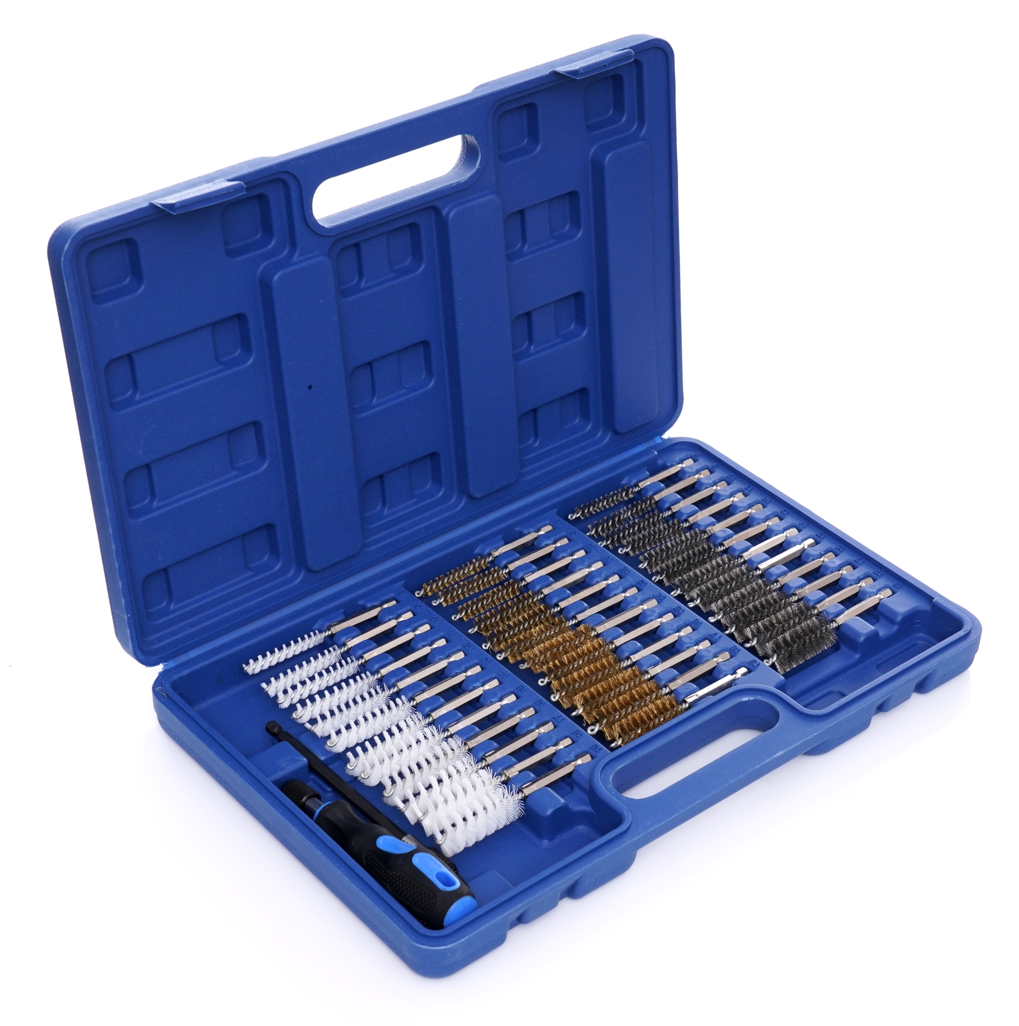 Kartáče na sedla vstřikovačů, sedla zapalovacích a žhavicích svíček. V sadě naleznete prodloužení, držák a 38 čisticích kartáčů různé tvrdosti. Kartáče jsou vhodné i pro použití v elektrických a pneumatických vrtačkách. Sada je nesmírně užitečná pro čištění a odjehlování válců, pouzder, trubek, sedel svíček, vstřikovačů atd.