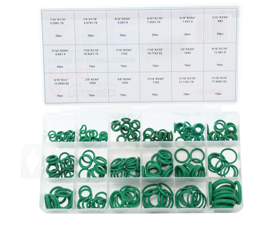 Sada velmi odolných O-kroužků pro klimatizaci, odolných vůči: ozónu, naftě, minerálním olejům a mazivům, olejům rostlinného a živočišného původu, lehkým topným olejům, emulzím olej-voda typu hsa, hsb, alifatickým uhlovodíkům jako: benzín, propan-butan, zředěným kyselinám, zásadám a solím (i při zvýšené teplotě), kyselým plynům. směsi glykolů s vodou do 150 °C.