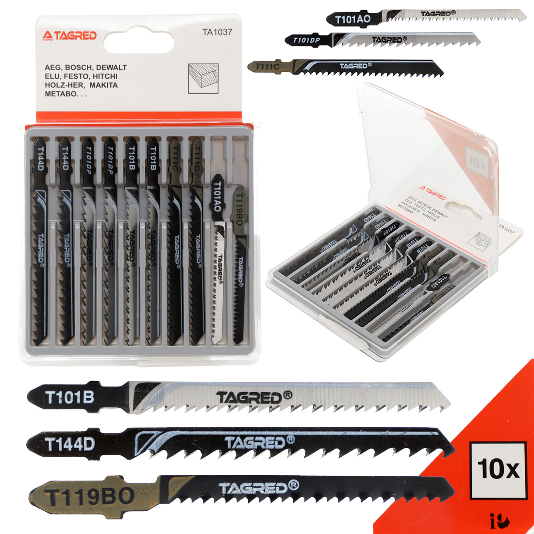 Profesionální sada pilových listů TAGRED určená k řezání dřeva a plastů, určená pro použití s přímočarými pilami s upínáním typu T.