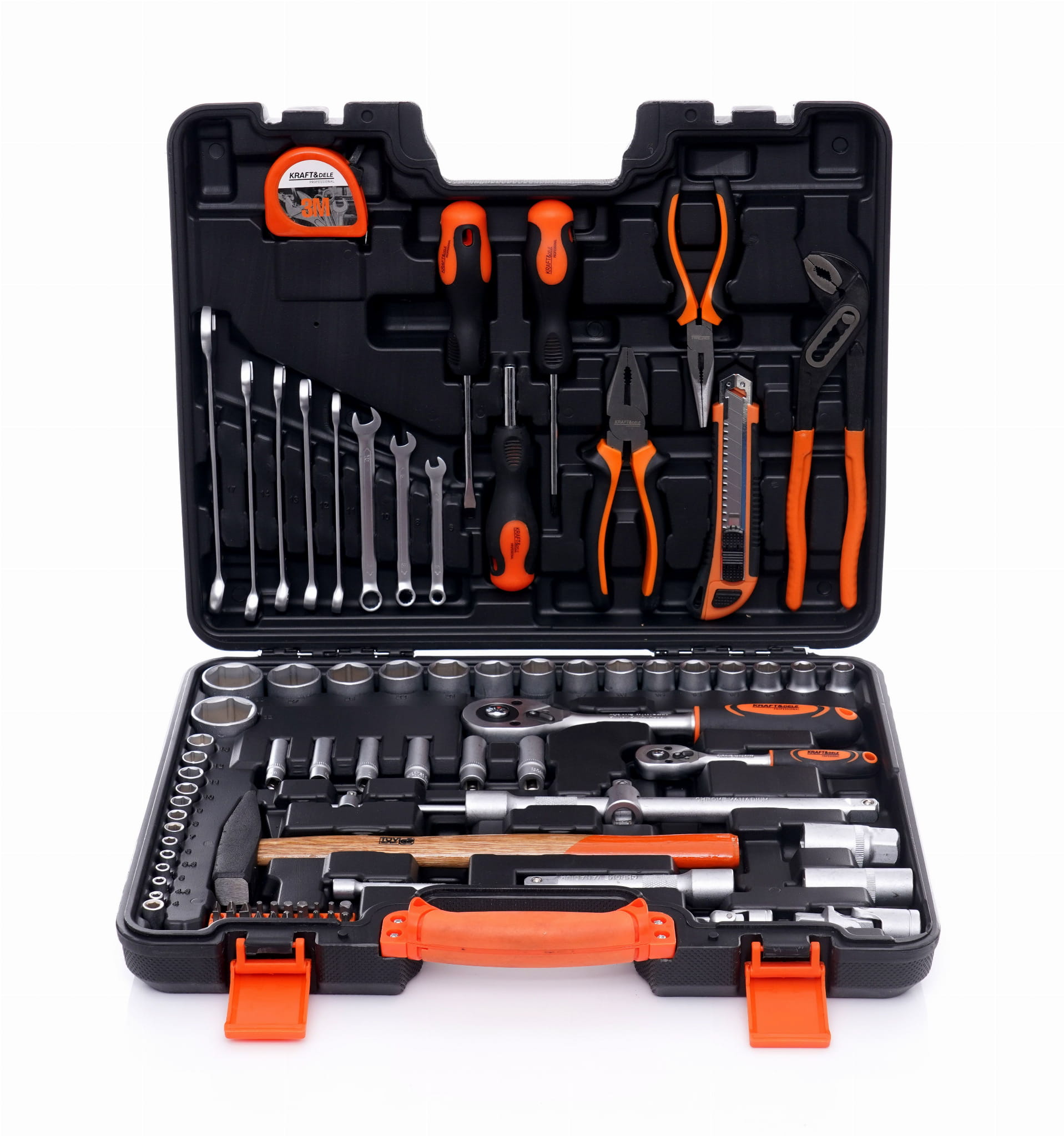 Extrémně rozsáhlá sada nářadí značky Kraft&Dele se symbolem KD10464. Nářadí se vyznačuje solidním provedením, odolnými materiály a praktickým kufříkem, ve kterém má každé nářadí své místo. Celá sada se skládá z 83 různých prvků, které zajistí správný výběr nástroje pro dané potřeby. Nástroje jsou vyrobeny z tvrzené chrom-vanadové oceli (CrV) určené pro dílenské nářadí. Chrom zaručuje odolnost oceli proti korozi, oxidaci, oděru a vysokou odolnost vůči vysokým teplotám. Přídavek vanadu inhibuje růst zrn během zpracování a zároveň zvyšuje tažnost jak kalené, tak popouštěné formy. Kufřík vyrobený z odolných plastů umožňuje udržovat pořádek a snadné přenášení nářadí. Každé nářadí má své určené místo, kde lze snadno najít potřebnou velikost klíče. Složení sady: 1-7" (180 mm) kombinované kleště 1-6" (150 mm) dlouhé kleště 1-9,5" (240 mm) kleště na vodní čerpadla 2-šroubovák 6x100 PH2x100 1-rukojeť šroubováku 150 mm 8-klíč 6,8,10,11,12,13,14,17 mm 1-nůž 18 mm se třemi čepelemi 1-metr 3 m 16-nástavec 1/2": 10,11,12,13,14,15,16,17,18,19,21,22,24,27,30,32 mm 1-ráčna 1/2" (24 zubů) 2-prodlužovací nástavec 1/2" x5" (125 mm) x10 (250 mm) 1-3 adaptér 1-univerzální spojka 1/2 2-zásuvka zapalovací svíčky 1/2"x16,21 mm 12-nástavec 1/4": 4,4.5,5,5.5,6,7,8,9,10,11,12,13 mm 1-adaptér 1/4 6-zásuvka 1/4: 8,9,10,11,12,13 mm 1-ráčna 1/4" (24 zubů) 1-prodlužovací nástavec 1/4" x3 (75 mm) 1-univerzální spojka 1/4" 1-posuvná tyč 110 mm 1-kladivo 300 g, Tuv/GS 20-bit 1/4x25 mm