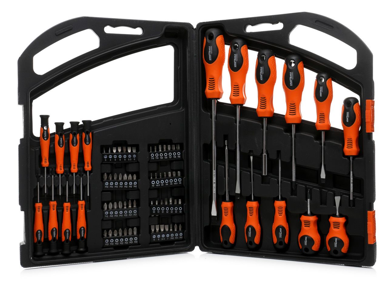 Sada šroubováků a bitů KD10904 značky Kraft&Dele se osvědčí v každé garáži nebo dílně. Přiložený kufřík usnadňuje skladování šroubováků.Použití vysoce kvalitních materiálů při výrobě šroubováků a bitů prodlužuje jejich životnost. Sada se skládá ze 75 dílů. SLOŽENÍ SADY: Tradiční šroubováky: - 5 plochých (6.5x38, 3.0x75, 5.5x75, 6.5x150, 8.0x200mm)- 4 křížové (PH2x38, PH0x75, PH1x75, PH2x100mm) Precizní šroubováky: - 3 ploché (2.0, 2.5, 3.0)- 2 křížové (PH0, PH00)- 3 TORX (T6, 8, 10) Bity + držák: - 11 plochých (3, 4, 5(3ks), 5.5, 6(3ks), 6.5, 7)- 14 křížových (PH0, PH1(2ks), PH2(9ks), PH3(2ks))- 7 TORX (T10, 15, 20, 25, 27, 30, 40)- 7 šestihranných (2, 2.5, 3, 4, 5, 5.5, 6)- 7 čtvercových (S0, 1(2ks), 2(2ks), 3(2ks))- 10 typu hvězdička (PZ0, PZ1(2ks), PZ2(5ks), PZ3(2ks))