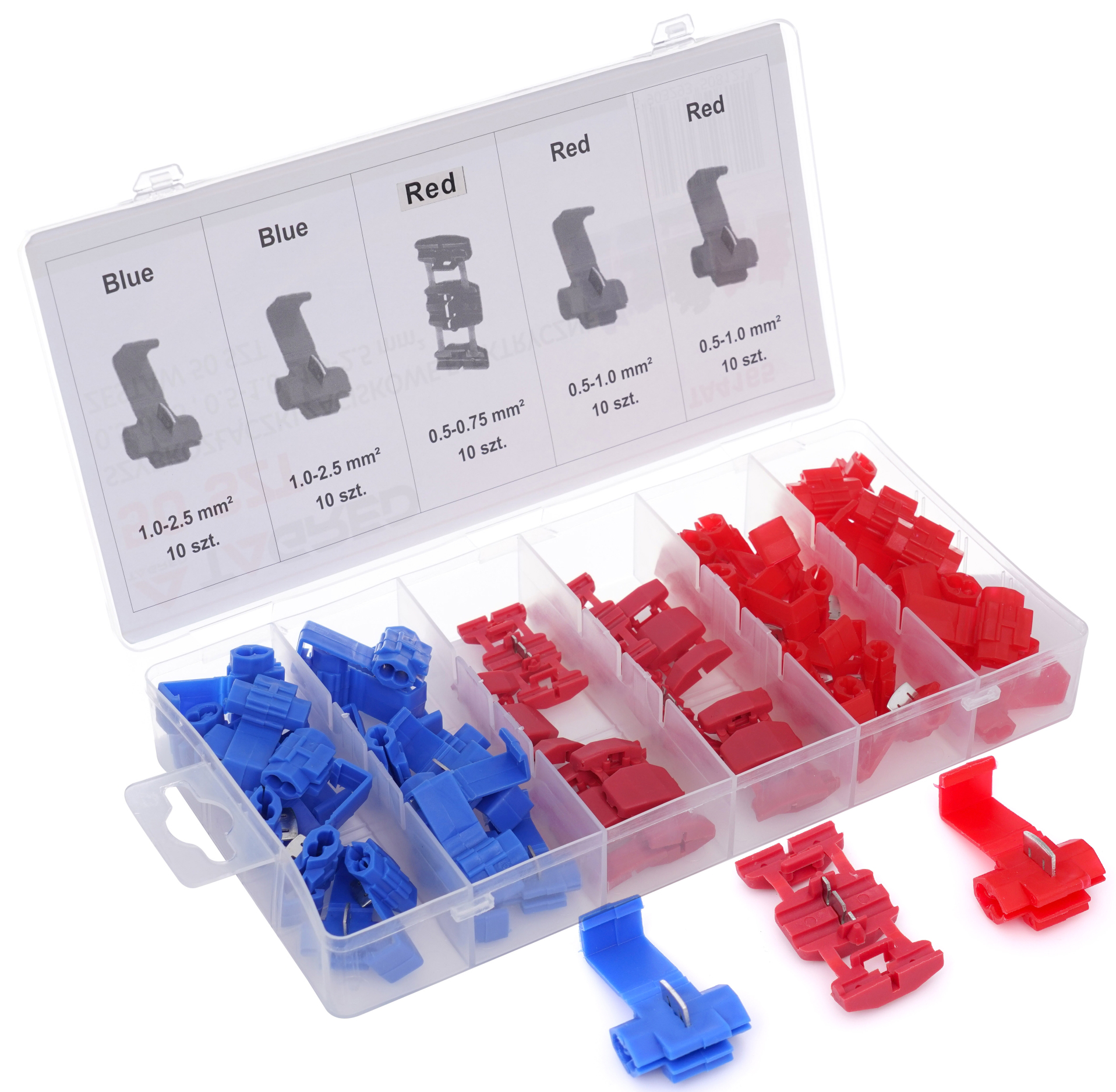 Sada barevných elektrických konektorů, které slouží k bezproblémovému a rychlému spojování elektrických vodičů bez použití specializovaných nástrojů. Stačí vložit konce upravených kabelů do rychlospojky a zacvaknout ji plastovým klipem. Rychlospojky pasují na nejoblíbenější průměry elektrických vodičů. Sada obsahuje 50 kusů a vše je umístěno v praktickém organizéru.
