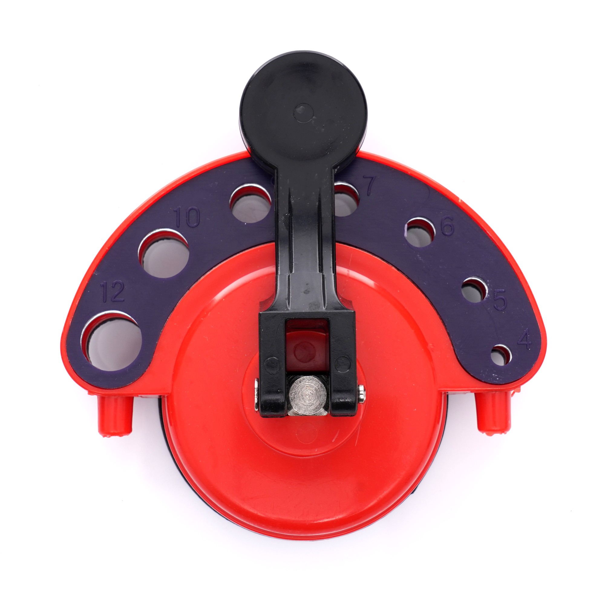 Vodítko vyrobené z odolného ABS plastu podporuje vrtáky o velikosti 4-12 mm. Má silnou přísavku o průměru až 6 cm a 7 vodicích otvorů o průměrech: 4, 5, 6, 7, 8, 10, 12 mm.