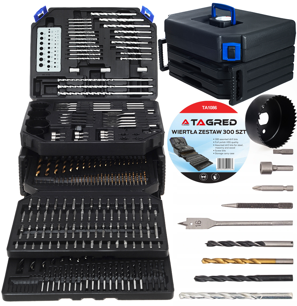 Bohatá, profesionální sada vrtáků a bitů - 300 kusů!5 sad vrtáků do betonu, kovu a dřeva, včetně děrovek a plochých vrtáků umístěných ve funkčním a odolném kufříku z plastu. Na šestém podnose se nachází specializovaná sada různých typů bitů pro šroubováky.
